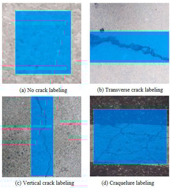 The annotation of images in the dataset plays a crucial role in improving the accuracy of training model performance for detecting and recognizing concrete cracks. The image annotation tool labelImg (https://github.com/tzutalin/labelImg, accessed on 12 December 2023) was employed in this study to annotate cracks, offering the convenience of labeling multiple categories and generating XML files directly. The annotation process involves manually marking the precise location of cracks in the original image and annotating the corresponding crack type adjacent to each marker. Subsequently, an XML file is generated containing information about crack locations for utilization by deep learning models for further training. Following completion of annotations, the program randomly selects 30% of images as a test group, while the remaining 70% are allocated for training and validation purposes. The four types of crack annotations in this paper are shown in Figure 2.