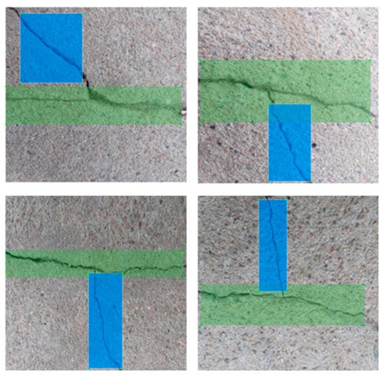 Furthermore, multiple types of cracks were identified in some of the images during the image labeling process. For this particular type of image, we applied different labels to various cracks during the labeling process. As a result, the database for model training and validation contains multiple labeled cracks within the same image. Therefore, the proposed model in this study is capable of addressing the issue of image recognition that involves multiple cracks. Some example diagrams of annotations in the database containing images of multiple cracks are depicted in Figure 3.