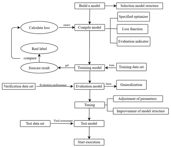 The model was compiled using the Adam optimizer and the cross-entropy loss function in this study. In the training process, the input of training set data leads to prediction results through forward propagation. The obtained results are subsequently compared with the actual labels, and loss is computed to update model parameters through back propagation, as depicted in Figure 6. The model’s performance is assessed by calculating the loss and accuracy on the validation set, which serves as an indicator of its generalization ability. The hyperparameters are fine-tuned and the model architecture is refined based on the performance of the model on the validation set and the weight file obtained from the initial round of training, with the aim of optimizing and enhancing its overall performance. Upon completion of model training, the performance of the model is assessed by evaluating it using the test dataset to obtain objective metrics such as recognition accuracy and loss rate.