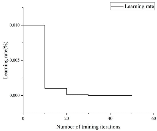The initial learning rate for training in this study was set at 0.01 and subsequently adjusted during the training iterations. The piecewise constant decay method was utilized in this study. After completing 10 training cycles, the learning rate was decreased to 0.1 times its initial value, as described in detail in Table 2 and Figure 7. The learning rate scheduling strategy facilitates a gradual decrease in the learning rate throughout the training process, promoting a more meticulous exploration of optimal model parameters. An elevated initial learning rate promotes the model’s rapid convergence towards the global optimum during early stages of training, followed by a gradual decrease in the learning rate to ensure a more stable and consistent convergence as training progresses. The proposed attenuation method can significantly enhance both the training efficiency and accuracy of the model.