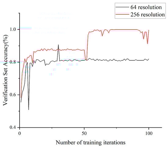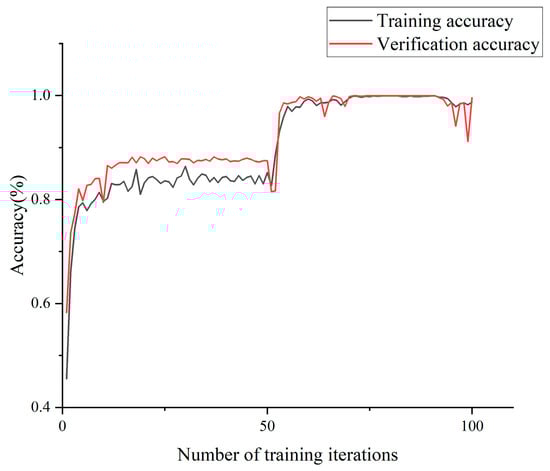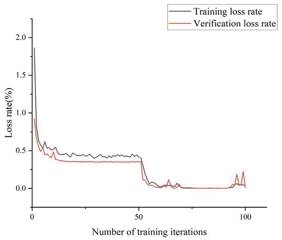 The model was trained using the aforementioned dataset, with a resolution set at 256 × 256 pixels. The loss rate and accuracy exhibited variations throughout the training iterations, as depicted in Figure 8 and Figure 9, respectively.