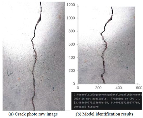 Additionally, local image interference was effectively mitigated by adjusting parameters such as brightness, introducing controlled noise, or modifying localized textures to accurately simulate specific interferences in different regions of the image. These interferences encompass uneven illumination, localized faults, and dirt. By incorporating local noise into the image, the model can effectively integrate features that demonstrate enhanced sensitivity to localized perturbations induced by noise. The aforementioned training significantly improves the model’s capacity to precisely identify and classify images amidst various local disruptions, consequently enhancing its accuracy and resilience for real-world implementations. Taking uneven illumination as an example, we selected a naturally illuminated image containing a crack as the original sample to investigate the impact of local variations in illumination intensity on the recognition accuracy of this model. The effects of local shadows and intense light in specific areas of the image were simulated using various image processing techniques, including the application of mask layers, adjustment of pixel values, and filtering. Consequently, three distinct crack images were obtained. The model was trained using the three crack images for the purpose of image recognition. Figure 13, Figure 14 and Figure 15 depict the original crack images along with their corresponding length and width parameters, as well as the results obtained from the model’s recognition process.
