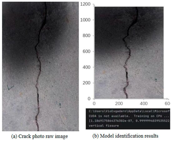 Finally, in order to investigate the practical applicability of the model in real-world scenarios, two approaches are employed for gathering authentic images depicting bridge cracks. The first approach involves conducting on-site visits to directly observe the cracks present on various bridges and gather corresponding images. The second approach entails searching for authentic images available on the Internet. Subsequently, a total of 30 photographs were collected from each of the four categories and employed to evaluate the precision of the trained model through recognition. The evaluation of the model’s performance in real-world scenarios and the provision of feedback for further improvement and optimization were facilitated. The objective of this identification verification experiment was to validate the practicality of the model, thereby providing a reliable tool and judgment basis for bridge safety detection in various fields. An example of the collected live crack images is shown in Figure 16, and the model output is shown in Table 4.