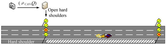 According to the relevant standards, the hard shoulder will only be opened when it is safe and with no obstructions. Drivers must obey the signs and speed limits to ensure their own safety as well as that of other road users, and the hard shoulder is applied as an extra lane only when it is declared open. If there is no effective signal on the hard shoulder, drivers should not use it as it is illegal and unsafe, and whether an accident occurs on the original road or the open hard shoulder, all hard shoulders should be closed to avoid affecting emergency vehicles. Due to the increasing popularity of CAVs, the composition of expressway traffic flow is expected to change in the future []. As shown in Figure 1, while considering setting up a hard shoulder opening strategy, it is also vital to fully consider the characteristics of connected vehicles and non-connected vehicles.