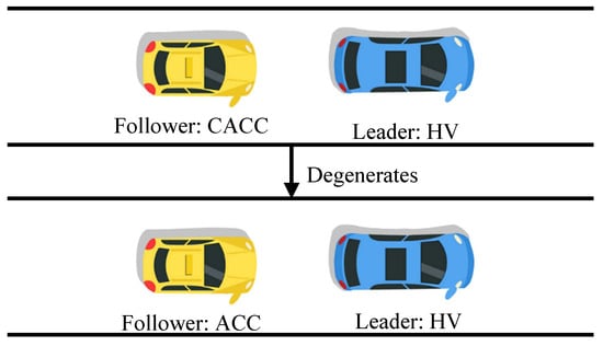 In a mixed traffic flow randomly composed of CAVs and HVs, we defined () as the penetration rate of CAVs. When the front vehicle of the CAV has a vehicle-to-vehicle communication function, these CAVs will adopt collaborative adaptive cruise control (CACC) mode, known as CACC vehicles [,,]; otherwise, they will follow with adaptive cruise control (ACC), known as ACC vehicles, as shown in Figure 2 [,]. Currently, the most common forms of car-following are: