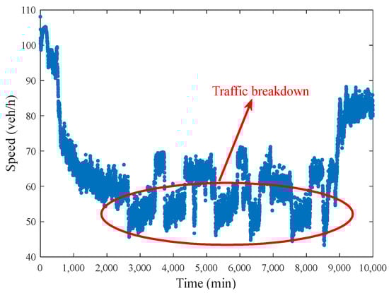 Considering the difference between the ability of the CAV and the HV to obtain traffic information in mixed traffic flow, it was assumed that the VMSs were evenly distributed on the road sections. The main basis for HSR in this paper is the traffic breakdown, as shown in Figure 3, which occurs when the average speed in a road section suddenly drops and does not recover for a long period of time. As mentioned in Section 2.2, there are variations in car-following models for mixed traffic flows with CAVs, and existing research has indicated that the traffic capacity differs across different penetration rates. Consequently, there are also differences in the phenomena of traffic breakdown at varying penetration rates. The unchanged traffic breakdown prediction method (with a penetration rate of 0) cannot accurately predict traffic breakdown in mixed traffic flows with CAVs. Therefore, hereinafter, we will propose a traffic breakdown prediction method in mixed traffic flows with CAVs as well as investigate the impact of different penetration rates on traffic breakdown in mixed traffic flows with CAVs, ultimately constructing HSR strategies in such situations. It is worth noting that the scenario in this paper is an ideal scenario that does not consider weather and other factors, and only discusses the impact of the traffic characteristics of CAVs and HVs.