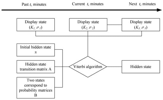 In order to predict the road traffic state in the next minutes, the display state sequence with a length of is obtained by first estimating , after minutes based on the road segment density and CAV penetration rate transition matrix and the current traffic observations. Since the breakdown state of the past minutes is known, the breakdown state before minutes is defined as the initial value of the hidden state, which corresponds to the initial hidden state distribution vector . Then, the Viterbi algorithm is used to predict the traffic breakdown state after minutes based on the display state sequence and the initial hidden state distribution vector as well as the hidden state transition probability matrix and the two-state corresponding probability matrix . The prediction process is as shown in Figure 4.