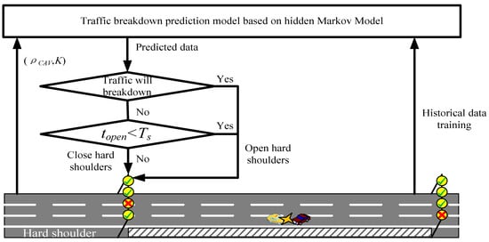 With the development of vehicle-road network technologies, the future traffic flow will appear in the form of hybrid network traffic flow for a long time. Due to the change in traffic characteristics, the current hard shoulder running strategy based on traditional traffic characteristics cannot effectively serve the hybrid network traffic flow scenario, and will even lead to the further deterioration of traffic congestion. In order to propose a hard shoulder running strategy suitable for a hybrid network environment, a traffic breakdown prediction method based on a hidden Markov model was established. Secondly, the characteristics of traffic breakdown in a hybrid network environment were analyzed. Finally, based on the traffic breakdown characteristics in a hybrid network environment, a dynamic hard shoulder running method based on the hidden Markov model was proposed. The effectiveness of HMMD-HSR was verified by simulation and comparison with HMM-HSR, LMD-HSR, and N-HSR. The simulation results show that the HMMD-HSR proposed in this paper can improve operation efficiency and reduce travel time in a congested expressway.