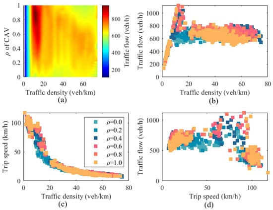 In this section, we analyze the effectiveness of the traffic breakdown prediction model and the hard shoulder opening strategy in the context of the hybrid network traffic flow described above. The experiment was carried out through the secondary development of SUMO and MATLAB, and the studied scenario is shown in Figure 6. The experimental scenario was selected from the basic section of the motorway, length = 5500 m, the number of lanes in the section was 3, and the speed limit value of the section was 110 km/h. The length of the hard shoulder was 400 m, and the speed limit value was 80 km/h (ref. [] showed that the speed of vehicles on the hard shoulder tends to be lower than 80 km when the hard shoulder is open). The basic characteristics of the traffic flow in the simulation scenario at different penetration rates are shown in Figure 7. The basic plots of density versus traffic flow of the road section at different penetration rates are presented in Figure 7a,b, from which it can be seen that the capacity of the road section gradually increases with the increase in the CAV penetration rate. The speed versus roadway density and speed versus roadway flow for different penetration rates are shown in Figure 7c,d. From Figure 7c,d, as the CAV penetration rate increases, the road section density and flow rate increase at the same speed.
