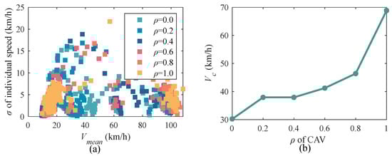 In addition, the historical data were processed to calculate the average speed and the standard deviation of the corresponding speed within the road section every 5 min, as shown in Figure 8a. Since the speed crash corresponds to the time period when the speed shows a sharp decrease, the average speed corresponding to the time period with the largest standard deviation is defined as , the crash speed. In this experiment, the permeability was selected as 0, 0.2, …, 1, and the corresponding crash speed of the road section was analyzed as shown in Figure 8b, from which it can be seen that as the penetration rate increased, the crash speed of the road network also showed the above trend.