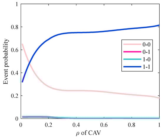 After obtaining the traffic breakdown critical speed, the historical data were combined to calculate the hidden state transition probability matrix A and the two-state corresponding probability matrix B. We defined the state of a road section as 1 when it was in the traffic breakdown state, and 0 otherwise, as shown in Figure 9. Since the of the CAV parameter is taken into account in the hybrid grid-connected environment, the value within the hidden state transition probability matrix is a variable that varies with . As seen in Figure 9, as the penetration rate increases, there are progressively fewer transfers of road segment states from 0–0, replaced by an increase in 1–1, which indicates an increase in the probability of road segment collapse as the penetration rate increases. For the convenience of presentation, this paper only showed the hidden state transition probability matrix when the penetration rate was 0 in Table 1. Table 2 shows the state of the collapse state corresponding to , , where the density of the road section is processed, 18 veh/km was selected as the interval, and K was divided into segments equally from 0 to , and the number of data points in each interval was taken as the value of the interval.
