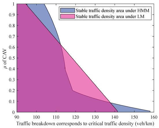 After obtaining the above traffic breakdown prediction parameters, the accuracy of the prediction model was tested by running the simulated road network, and at the same time, the traffic breakdown prediction model based on the logistic model was used for comparison (denoted as HMMD and LMD, respectively). The relationship between the probability of the occurrence of traffic breakdown and the traffic density of the upstream road section under different penetration rates was finally obtained, as shown in Figure 10. In order to explore the difference in critical density under HMMD and LMD more intuitively, the traffic density interval when no traffic breakdown occurs was defined as the stable traffic density area, which is shown in Figure 11. With in the range of 0.1–0.6, HMMD can detect a traffic breakdown phenomenon at a much lower traffic density. At other penetration rates, the LMD model will determine that a lower traffic density will produce traffic breakdown.