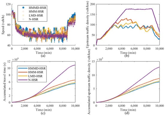 The accumulated travel time of the road segments under the four hard shoulder opening modes are shown in Figure 13c. From 0 to 2800 s, the accumulated travel time of the road segments remained the same during this period because the hard shoulder was not opened for all four modes. As the hard shoulders opened after 2800 s, respectively, the accumulated travel time of the road segments started to differ significantly. The accumulated travel time of the road segments under HMMD-HSR and LMD-HSR were lower than those under HMM-HSR. In addition, the accumulated travel time of the road segments under HMMD-HSR were lower than those under LMD-HSR, with the values of 5.5199 × 106 s and 5.8385 × 106 s, respectively.