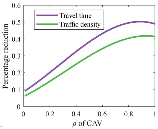 Since there are differences in the probability of traffic breakdown under different permeability , there are also differences in the degree of hard shoulder opening enhancement effect under different permeability . In order to analyze the effect of HMMD-HSR under different penetration rates , in this paper, we set as 0, 0.2, 0.4, 0.6, 0.8. and 1.0, respectively, and the statistics of the accumulated upstream traffic density and travelling time are shown in Table 4, while the percentage of accumulated density and accumulated travelling time reduction under HMMD-HSR are shown in Figure 14 using N-HSR as a baseline. It can be obtained from Table 4 that both the accumulated density and accumulated travel time decreased significantly with increasing permeability . From Figure 14, it can be seen that the degree of the enhancement effect of HMMD-HSR becomes better and better as the penetration rate increases.