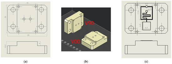 Flat inserts, shown in Figure 1a, have been used in step (a). Two-part orientations to the print direction were analysed: orthogonally (V00) and parallel (V90), according to [50], where the V00 orientation produced resin inserts with higher transparency, while the V90 orientation produced inserts with higher resistance (Figure 1b). Compared to [51], a simplified flat insert geometry has been chosen to reduce the wall side effect during injection moulding.