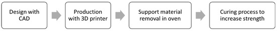 The inserts were produced with the Projet 2500 plus printer (3D System, Rock Hill, NC, USA). The resin selected was commercial VisiJet® M2S-HT250, provided by 3D Systems and fully tested for this kind of application [50], due to its ability to withstand temperatures up to 250 °C [51]. Three inserts were produced for each flat configuration (V00 and V90), and one microstructured insert was produced for each combination of channel shape and width. The inserts were suddenly postprocessed with a heat treatment at 70 °C for 3 h to eliminate the wax that material jetting technology uses as support material, while a second treatment at 70 °C for 8 h was used to stabilise deflections. Figure 2 shows the main fabrication steps.