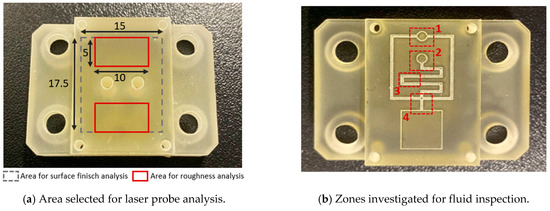 The inserts and samples were analysed with a qualitative inspection, executed with a digital 3D microscope, RH2000 (Hirox, Tokyo, Japan), and quantitative measures (feature profiles and roughness) were inspected with a the laser probe scan, PF60 (Mitaka, Tokyo, Japan). The resin inserts and samples were firstly visually inspected to observe the presence of defects, and then the functionalized surface was scanned with the laser probe with details on an area of 17.5 × 15 mm to evaluate the surface finish and on an area of 10 × 5 mm, measured in two different zones, for roughness analysis. The scanning frequency for each analysis was set equal to 0.1 mm. In Figure 3a, a plot of the mentioned area on the insert is shown. For roughness analysis, the average surface roughness (Sa) and the maximum peak to valley height (Sz) were compared between the 1st sample and the 50th sample produced.