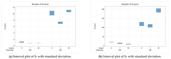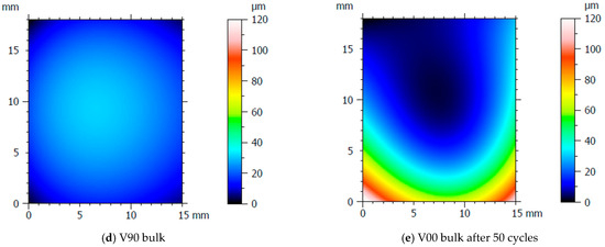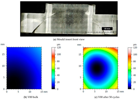 After the production of the samples, all the inserts exhibited cracks along their cross-sections (Figure 4a) due to the high pressure involved in the micro injection moulding process and the brittle behaviour of the resin. A test conducted on the inserts used to produce a single sample showed that these cracks appeared after the first shot. This damage, however, seems to have no impact on sample production because the insert is well blocked inside the master plates of the steel mould and remains compact inside its housing. Furthermore, the surface morphology analysis (Section 2.3) showed how the moulding cycle affected the insert cavity. Figure 4 presents the evaluation of the cavity surface flatness for the V00 and V90 inserts before and after sample production (Figure 4b,e). Both bulk inserts maintain flatness in the range of 30 µm, while at the end of the moulding cycle, a convex behaviour of about 100 µm is observed on the surface of both, with the minimum in the centre for V00 (Figure 4c) and close to the running gate for V90 (Figure 4e). This variation in surface flatness highlights the viscoelastic nature of the insert polymer. During the moulding cycles, cavity pressure induces the compression of the insert, increasing its stress levels and leading to permanent deformation, as found by [46]. The interval main plot of Sa and Sz in Figure 5 shows no significant roughness evolution for both inserts before and after the moulding cycle.
