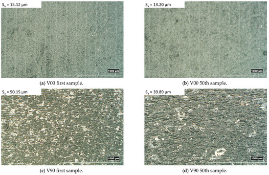 The analysis of the surface roughness of the 1st and 50th samples produced with the V00 and V90 insert configurations (Figure 8) showed an improvement in the surface roughness of all samples, especially for those moulded with the V90 insert (from 50 µm to about 40 µm). The orientation of the inserts on the print plate significantly affects the quality of the samples in terms of surface roughness and geometry. The V90 inserts have a bottom surface cavity belonging to the y-z plane, allowing the layering effect found in the z direction on each part produced by additive processes (Figure 6c). Moreover, the layering weakens the mechanical properties and leads to higher deformation of the insert, resulting in parts with decreasing thickness. By contrast, the V00 inserts, with the cavity on the x-y plane, guarantee smoother parts with more regular thickness (Figure 7b and Figure 8a).