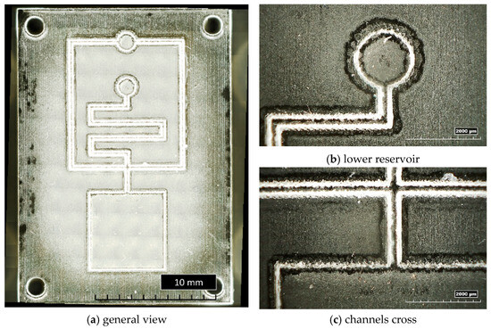 Figure 9 shows a general overview of the microstructured insert cavity, with inverted channels having a trapezoidal cross-section and a smaller base size of 200 µm (T200) (Figure 9a), as well as details of the lower circular reservoir (Figure 9b) and of the cross of the microchannels close to the bottom square reservoir (Figure 9c). The residuals of wax, discussed in the previous section, are clearly visible as a white layer all around the microstructures.