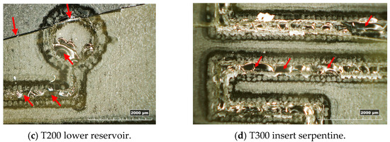 In Figure 10, examples of resin inserts with inverted trapezoidal (T300) and semi-circular (S200) microchannels after twenty moulding cycles are shown. All the inserts present the same defects: the generation of a crack along the cross-section (as observed in Figure 4a), a crack on the top surface located in the middle (Figure 10a,c), and the loss of resin along the microstructures and reservoirs of microfluidic features (Figure 10a–d). These defects should be attributed to the high forces involved in the µIM process and the brittle behaviour of the resin, as discussed in Section 3.1.