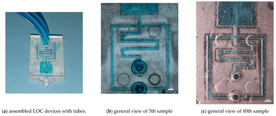 Figure 12b,c shows the perfect channel filling of the 5th and 10th testers, demonstrating the possibility of using resin inserts for prototyping microfluidic devices with microinjection moulding. Moreover, in Figure 12c, the irregularity of the channels due to insert wear during the moulding cycles can be seen, as discussed in Section 3, which did not compromise the functionality of the device.
