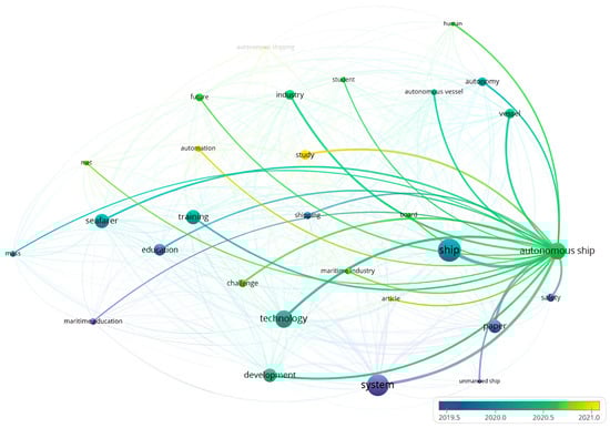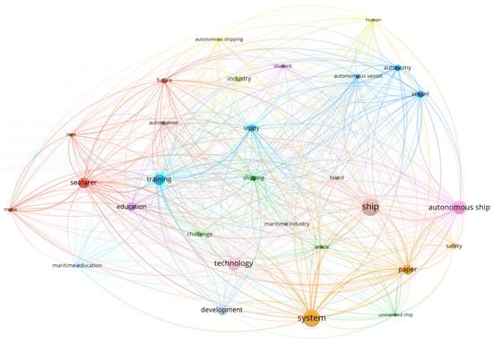 The choice of keywords in our study was based on a thorough consideration of the scope and objectives of our research. We wanted to identify and analyze relevant literature on the topics of “autonomous ships” and “maritime education”, focusing particularly on the overlaps between these two fields. These keywords reflect the primary focus of our study and serve as the basis for our search strategy. We supplemented our primary keywords with related terms such as “MASS ships”, “autonomous vessels” and “maritime training”. With these additional keywords, we wanted to cast a wide net and capture all relevant literature that could not be explicitly captured by our primary keywords alone. The graphical analyses in Figure 2 and Figure 3 demonstrate the value of the tool for recognizing the effective choice of the keywords “autonomous ships” and “maritime education” within the broader research landscape. By visually representing the semantic connections with the 30 most commonly used keywords, the VOS Viewer allows for a detailed examination of the keywords and overlaps that define the scientific discourse in these areas. This approach not only improves our understanding of the prevailing research topics but also helps to identify the potential areas of convergence or divergence within the overarching research framework.