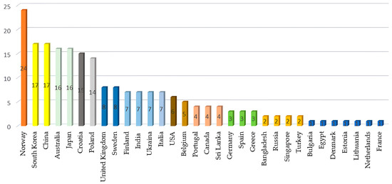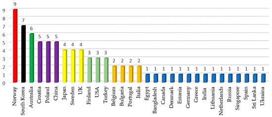 The leading research countries based on the metrics considered (the weighted total number of authors and weighted number of first authors in the selected articles) are shown in Figure 4 and Figure 5, respectively. Contributions made by countries such as Norway, Australia, Japan, Croatia and Poland contributed the most during the reporting period (the weighted total number of authors and weighted number of first authors in the selected articles).