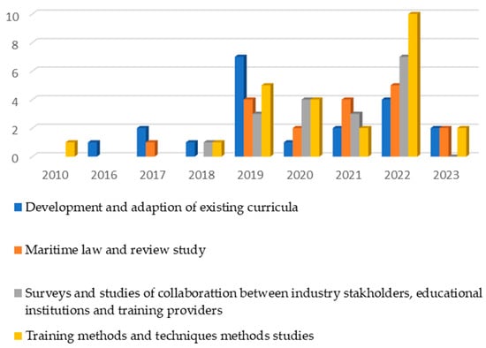 We have also carried out a historical analysis of the publications to determine the attention that researchers have paid to the different topics of maritime education related to autonomous ships. To this end, we used the results of the analysis presented in the next RQ (RQ2) to classify the studies and used the number of publications per year on each research topic to determine the historical trends. Microsoft Excel was used for this analysis.