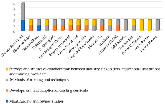 Figure 7 shows the co-authorship. Of all the authors of the 81 articles, the authors to whom at least two articles belonged were selected. This resulted in 18 of the 190 (9%) individual authors meeting these criteria, suggesting that the vast majority of researchers produced a rather limited number of publications in the field of education and training of seafarers for MASS. The finding that only a small percentage of authors contributed to several articles indicates a broad engagement of different researchers in the field of education and training of seafarers for MASS. The data do not indicate a concentration of output from a small group of authors but rather a diverse and distributed network of contributors.