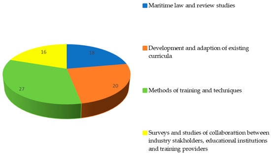 - Maritime law and review studies—This category of studies has received much attention in research. Since the MASS is a new technology, legal scholars and lawyers are concerned with new concepts and the possibilities of legal regulation of new terms. The review studies were described in the introductory section of this article to establish the novelty of the present study, and therefore, the discussion of this category of studies will not be repeated here. We have linked the aforementioned scholarly work to develop the possibilities of the topic in the context of maritime education related to autonomous ships (18 papers were included in this section).