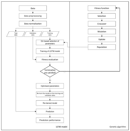 Integrating an LSTM neural network with a GA involves combining the learning capability of the neural network to model sequential data with the optimization capability of the genetic algorithm to search for the best set of hyperparameters for the neural network. The specific steps involved in this process are detailed below: