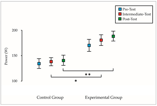 | Post-test (W) | 140.10 ± 9.21 | 186.83 ± 10.69 |
