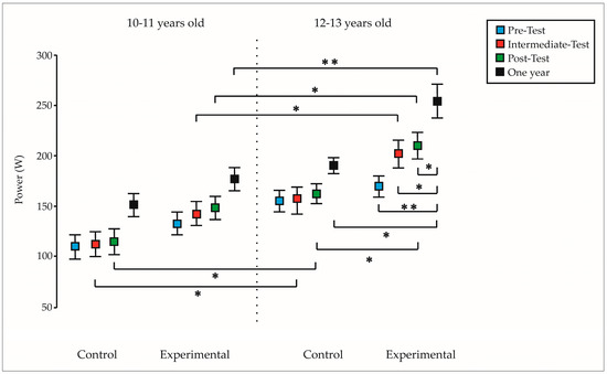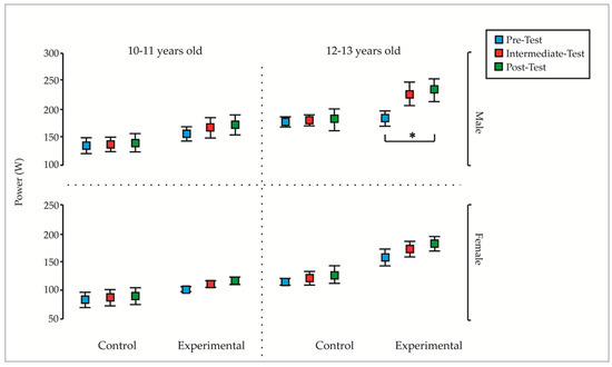 | Pre-test (W) | 112.05 ± 12.13 | 156.38 ± 10.37 | 134.28 ± 11.22 | 171.97 ± 9.74 |