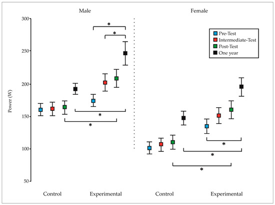 | Post-test (W) | 116.61 ± 12.74 | 163.58 ± 9.97 | 150.10 ± 11.67 | 211.32 ± 13.35 |