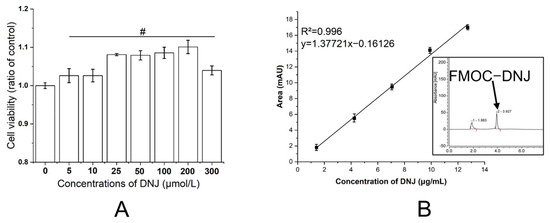 (A) Cytotoxicity test of DNJ at different concentrations using a CCK−8 assay. Three replicates were set for each concentration of DNJ, and the experiment was performed four times. (B) Measurement of FMOC-derived DNJ via high-performance liquid chromatography, representative picture, and the standard curve. Each sample was analyzed three times. # means the p value < 0.05. One-way ANOVA with Tukey test was used to analyze the significance.