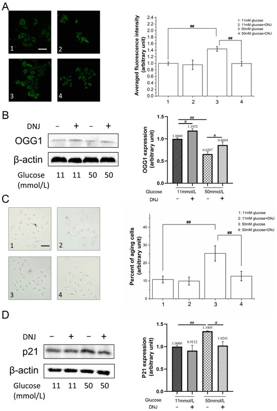 (A) Immuno-staining of 8-OHdG. HUVEC were cultured in 11 mmol/L glucose (1), 11 mmol/L glucose and DNJ (2), 50 mmol/L glucose (3), and 50 mmol/L glucose and DNJ. Scale bar is 50 µm. (B) Western blotting detection of the expression levels of OGG1 in cells cultured in 11 mmol/L and 50 mmol/L glucose with or without DNJ treatment. (C) SA-β-gal staining of senescent cells. HUVEC were cultured in 11 mmol/L glucose (1), 11 mmol/L glucose and DNJ (2), 50 mmol/L glucose (3), and 50 mmol/L glucose and DNJ. Scale bar is 50 µm. (D) Western blotting detection of the expression levels of p21 in cells cultured in 11 mmol/L and 50 mmol/L glucose with or without DNJ treatment. Three replicates were set for each sample, and each experiment was performed three times. # means the p value < 0.05, ## means the p value < 0.01. One-way ANOVA with Tukey test was used to analyze the significance.