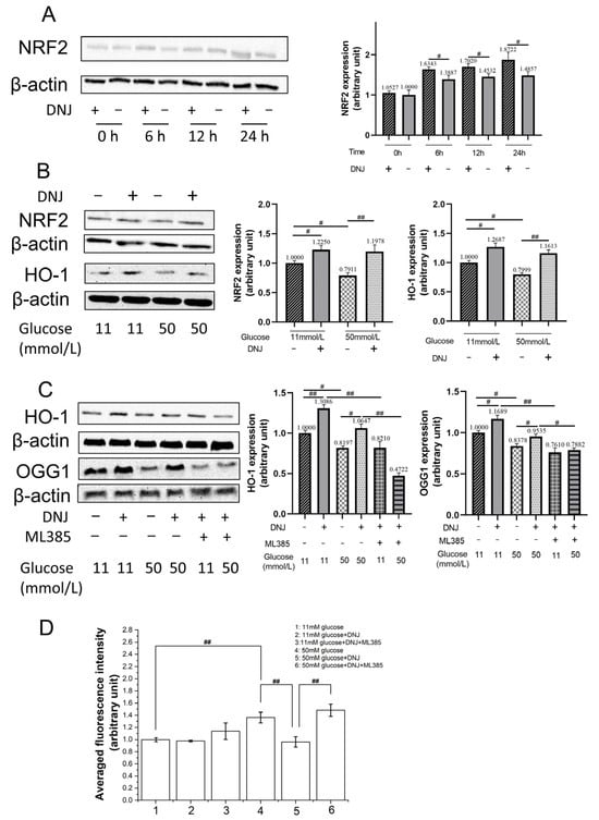 (A) Western blotting detection of NRF2 expression levels in HUVEC 0, 6, 12, 24 h post the treatment using DNJ. (B) Western blotting detection of the expression levels of NRF2 and HO-1 in HUVEC cultured in media containing 11 mmol/L and 50 mmol/L glucose, with or without DNJ treatment. (C) Western blotting detection of the expression levels of HO-1 and OGG1 in HUVEC. The cells were cultured in media containing 11 mmol/L and 50 mmol/L glucose. DNJ and ML385 treatments are shown in the figure. (D) Immuno-fluorescence staining of 8-OHdG in HUVEC. The cells were cultured in media containing 11 mmol/L and 50 mmol/L glucose. DNJ and ML385 treatments are indicated in the figure. Three replicates were set for each sample, and each experiment was performed three times. # means the p value < 0.05, ## means the p value < 0.01. One-way ANOVA with Tukey test was used to analyze the significance.