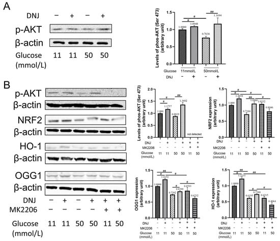 (A) Western blotting detection of the expression levels of phosphorylated AKT (ser473) in cells cultured in media containing 11 mmol/L and 50 mmol/L glucose, with or without DNJ treatment. (B) Western blotting detection of the expression levels of phosphorylated AKT (ser473), NRF2, HO-1, and OGG1 in HUVEC. The cells were cultured in media containing 11 mmol/L and 50 mmol/L glucose. DNJ and MK2206 treatments are indicated in the figure. Three replicates were set for each sample, and each experiment was performed three times. # means the p value < 0.05, ## means the p value < 0.01. One-way ANOVA with Tukey test was used to analyze the significance.