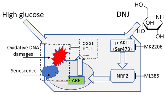 It is well-known that high concentrations of glucose induce the production of reactive oxygen species (ROS), which further lead to cellular disorders and cell death. Given the facts that DNJ treatment potentiates NRF2 anti-oxidative signaling [25,26], in this study, we investigated whether the NRF2 antioxidative response was stimulated by DNJ treatment in high-glucose-challenged cells. Our results showed that DNJ could ameliorate high-glucose-induced oxidative DNA damage and senescence through activating NRF2. We further identified that DNJ activated AKT to stimulate NRF2 anti-oxidative signaling and led to the upregulation of OGG1, which facilitated the repair of oxidative DNA damage in high-glucose-challenged cells. This study provided new insight into the mechanism of DNJ in mitigating cellular damage caused by a high concentration of glucose.