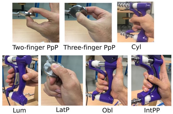 Twelve males and ten females, aged on average 35 ± 9 years, were included in the study. Selection criteria ensured gender balance in the dataset, ages ranging from 20 to 65 years, and no reported upper limb pathologies. Prior to participation, all subjects gave their informed written consent for the study, which was approved by the ethics committee of our university (reference number CD/31/2019). Participants performed seven representative grasps of ADL (Figure 1), based on the grasp taxonomy by Vergara et al. [27]: two and three fingers pad-to-pad pinch (PpP), cylindrical grasp (Cyl), lumbrical grasp (Lum), lateral pinch (LatP), oblique palmar grasp (Obl), and intermediate power-precision grasp (IntPP).