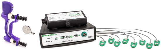 Muscle activity was recorded using an eight-channel sEMG device from Biometrics Ltd., sampling at 1000 Hz. Integral dry reusable sEMG electrodes (SX230) were employed, featuring a gain of 1000, a bandwidth ranging from 20 Hz to 460 Hz, and noise levels below 5 µV. Grasp effort was measured using hand grip and pinch dynamometers (Figure 2) also from Biometrics Ltd. Signals from the sEMG electrodes and dynamometers were synchronized using the provided Biometrics software version 11.02.