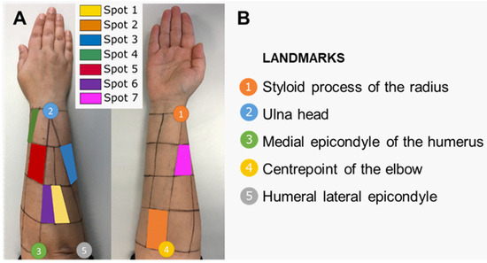 The sEMG electrodes were positioned using a grid drawn on the forearm, guided by five easily identifiable anatomical landmarks. Subjects were seated comfortably with their elbow resting on a table, their arm flexed at a 90° angle relative to the forearm, and the palm of the hand facing them. The grid defined 30 different spots covering the entire forearm surface (Figure 3). The electrodes were placed in the center of seven of these spots, based on the spot groups obtained in a previous work [18] (Figure 3, Table 1), and were set out in a longitudinal direction. Before placing electrodes, hair was removed by shaving and the skin was cleaned with alcohol.