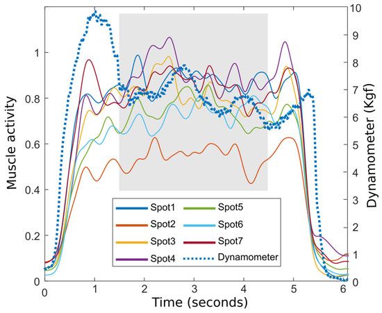 Example of the experiment. Each line corresponds to the measurement of the muscle activity of each spot for one subject during the grasping activity. The grey square corresponds to the 3 s used in the subsequent analyses.