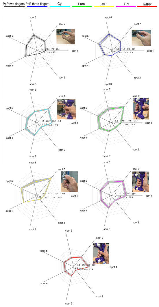 Table 3 shows spots with significant differences between grasps. Four cases presented no spots with significant differences: two-finger PpP versus three-finger PpP and Lum grasp, Lum grasp versus LatP, and Obl grasp versus IntPP grasp. On the contrary, Cyl grasp versus Lum grasp and LatP showed significant differences in almost all spots. Spot 5 did not exhibit significant differences between any grasps.