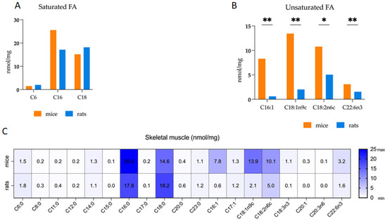 The comparison of selected fatty acids concentrations from mice and rats skeletal muscle samples. (A,B): All of the values expressed as median interquartile range; * p < 0.05, ** p < 0.01. Multiple Mann–Whitney test; n = 6 per animal group. (C): Heat map. Fatty acid level expressed as median interquartile range. Caproic Acid (C6:0); Caprylic Acid (C8:0); Undecanoic Acid (C11:0); Lauric Acid (C12:0); Myristic Acid (C14:0); Pentadecenoic Acid (C15:0); Palmitic Acid (C16:0); Palmitoleic Acid (C16:1); Heptadecenoic Acid (C17:0); cis-10-Heptadecenoic Acid (C17:1); Stearic Acid (C18:0); Oleic Acid (C18:1n9c); Linoleic Acid (C18:2n6c); Arachidic Acid (C20:0); cis-11-Eicosanoic Acid (C20:1); Linolenic Acid (C18:3n3); cis-8,11,14-Eicosatrienoic Acid (C20:3n6); Tricosanoic Acid (C23:0); cis-4,7,10,13,16,19-Docosahexaenoic Acid (C22:6n3).