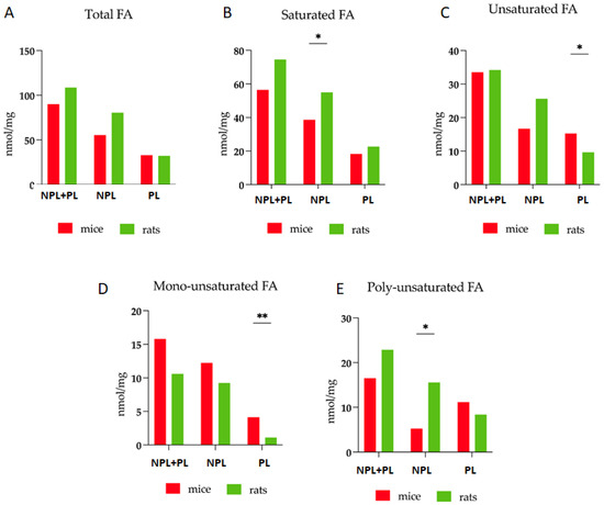 Comparative analysis of fatty acid profiles in liver of mice and rats. Content of fatty acids (FA) derived from polar (PL) and non-polar (NPL) lipids in liver of mice and rats. All of the values expressed as median with interquartile range; Multiple Mann–Whitney test; n = 6 per animal group; * p < 0.05, ** p < 0.01.