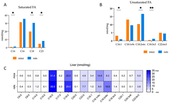 The comparison of selected fatty acids concentrations from mice and rat liver. (A,B): All of the values expressed as median ± quartile range; * p < 0.05, ** p < 0.01. Multiple Mann–Whitney test; n = 6 per animal group. (C): Heat map. Fatty acid level expressed as median interquartile range. Caproic Acid (C6:0); Caprylic Acid (C8:0); Myristic Acid (C14:0); Pentadecenoic Acid (C15:0); Palmitic Acid (C16:0); Palmitoleic Acid (C16:1); Heptadecenoic Acid (C17:0); cis-10-Stearic Acid (C18:0); Oleic Acid (C18:1n9c); Linoleic Acid (C18:2n6c); Arachidic Acid (C20:0); cis-11-Eicosanoic Acid (C20:1); Linolenic Acid (C18:3n3); cis-8,11,14-Eicosatrienoic Acid (C20:3n6); Tricosanoic Acid (C23:0); cis-4,7,10,13,16,19-Docosahexaenoic Acid (C22:6n3).