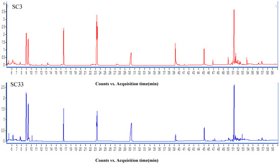 Figure 2 shows the TIC of emulsion cosmetics acquired by GC-MS. The differences mainly occurred in the part after the retention time of 45 min, and the percentage of differences still needed to be obtained by exporting the data to statistical software for further processing.