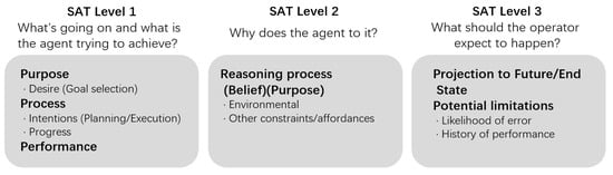 In order to clarify transparency requirements to understand the intelligent agent’s task parameters, logic, and predicted outcomes, Chen et al. developed the Situation Awareness-Based Agent Transparency (SAT) model [25], based on the theory of situation awareness (SA) [26], which mirrors the three levels of perception, comprehension, and projection (see Figure 1). In the SAT model, the basic information about the agent’s current state and goals, intentions, and proposed actions are provided at the first level. The agent’s reasoning process and the constraints/affordances when planning those actions are provided at the second level. Information regarding the agent’s projections of the future states (such as predicted consequences and likelihood of success/failure) are provided at the third level. Previous studies have already confirmed the effects of SAT on operator trust. For example, Stowers et al. indicated that with increasing levels of agent transparency, operator performance and reliance on key parts of the interface increased [27]. Mercado et al. found that operator performance and trust in the agent increased as a function of the agent transparency level [20]. Chen et al. found that the SAT model continues to be an effective tool for facilitating shared understanding and proper calibration of trust in human–agent teams [24]. And in recent studies, conveying the automation’s decision-making rationale via the display resulted in an increase in the participants’ level of trust, which became more calibrated over time [28,29].